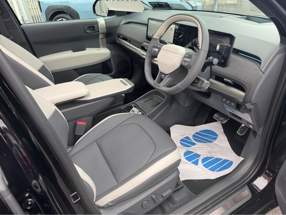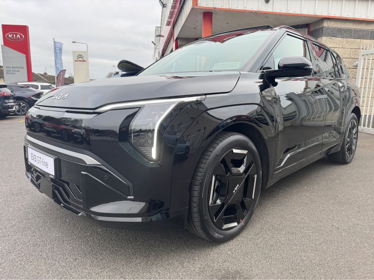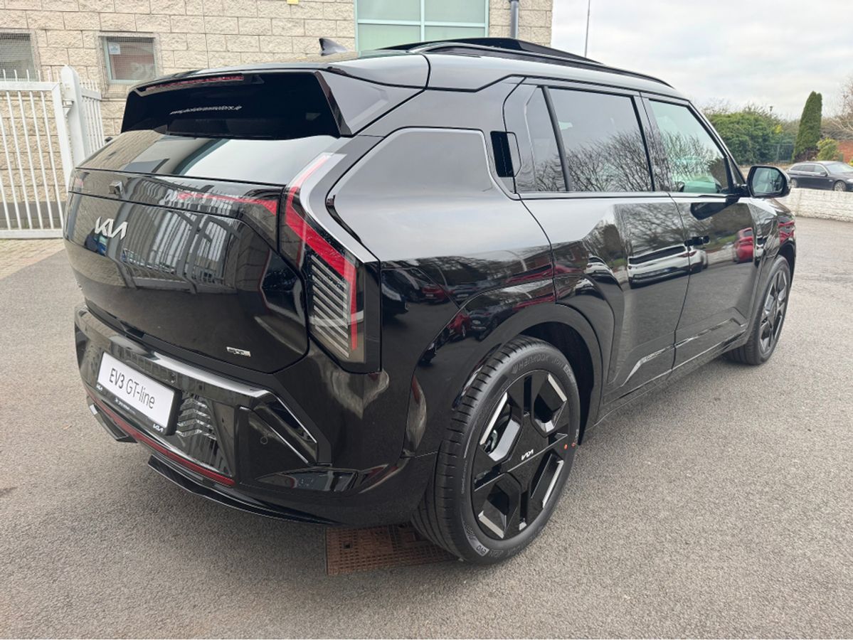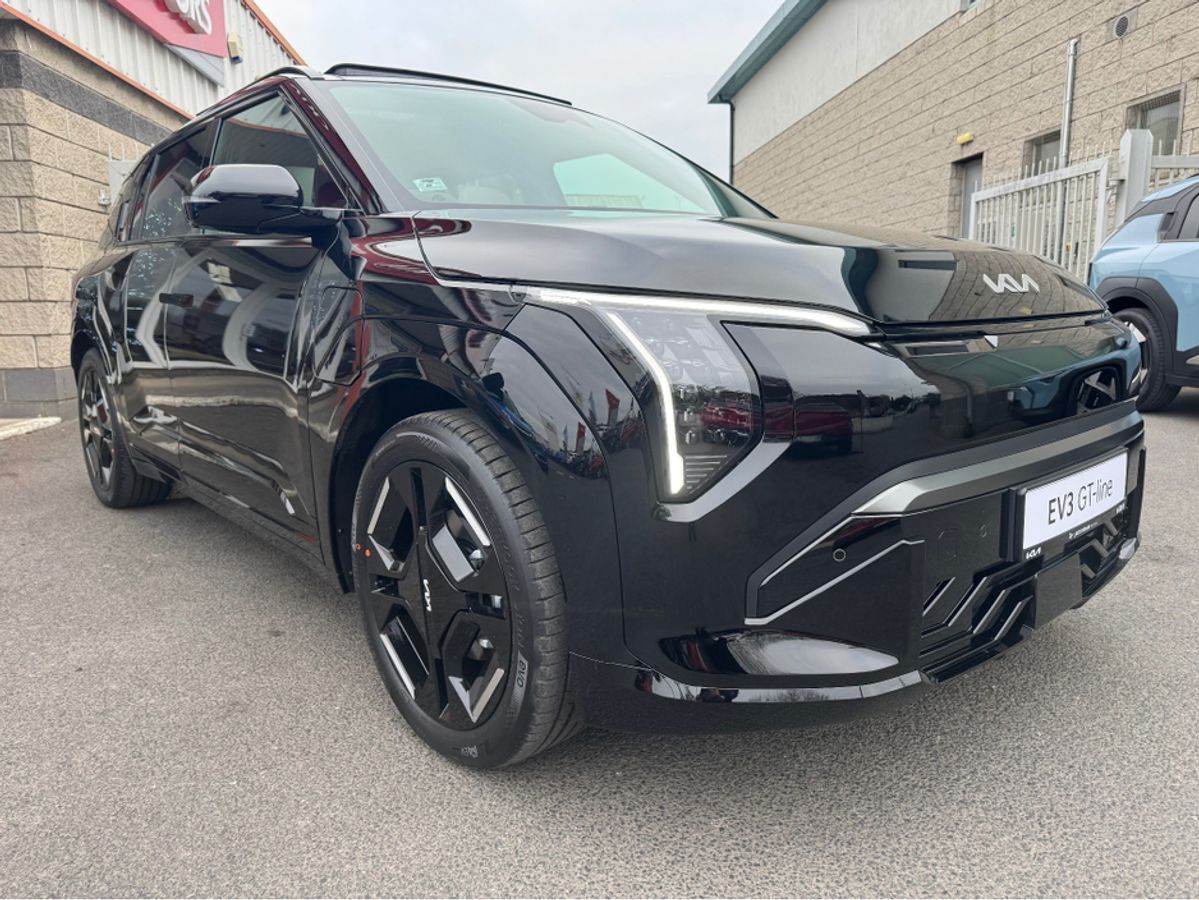 Brand new Kia EV3 GT Line in Aurora Black Pearl with Full Grey & White Leather Upholstery. This model comes with 19" Alloys, Sunroof, Power Tailgate, Head Up Display, Forward Collision Avoidance Assist 2, Highway Driving Assist 2, Vehicle-2-Load (V2L) Capability with